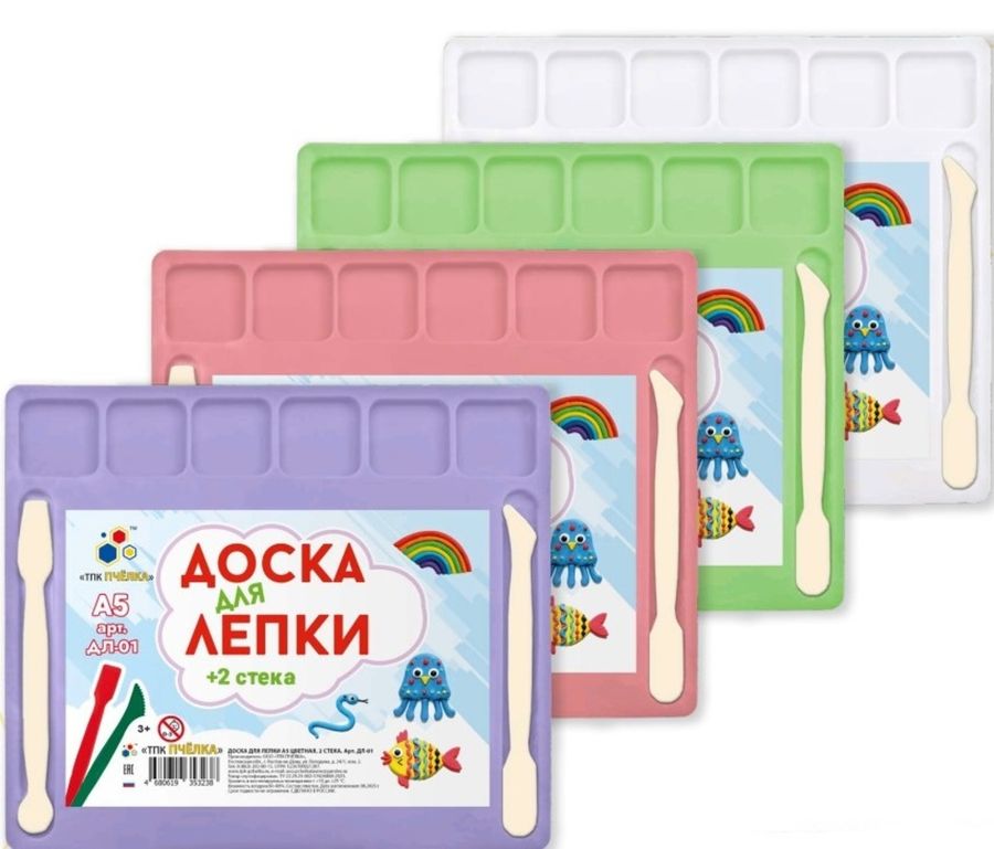 Доска для лепки А5 пластик Нежный микс отделения для пластилина + 2 стека ассорти ПЧЕЛКА ДЛ-01
