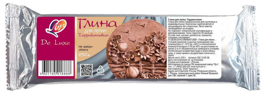 Полимерная глина ТМ "ЛУЧ" полностью готова для работы. Не требует обжига, готовое изделие затвердевает на воздухе. Состав: мел, каолин, целлюлоза, пигменты, глицерин, консервант. Фасовка брусок 250 грамм в фольгоированном пакете. Условия хранения: в крытых помещениях при температуре от -15ºС до +40 ºС и относительной влажности воздуха от 40 до 80 % на расстоянии не менее 2 м от нагревательных приборов в условиях, исключающих воздействие воды и агрессивных сред, а также прямого воздействия солнечного света.