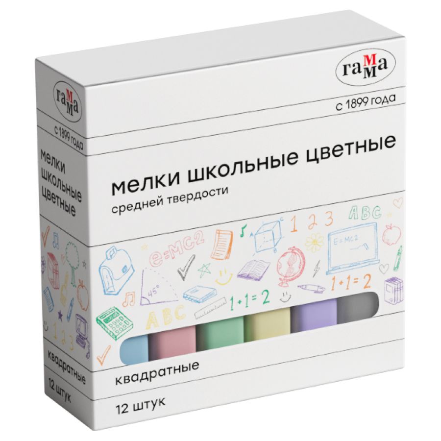Набор из 12 квадратных цветных школьных мелков ГАММА предназначен специально для занятий в учебных заведениях. В упаковке 12 штук в 9-ти цветах: красный, голубой, зелёный, жёлтый, фиолетовый, оранжевый, белый. Удобная форма и мягкое письмо. Мелки средней твёрдости имеют натуральный состав на основе мела, гипса, воды и пигментов. Мел удобно лежит в руке, не царапает рабочую поверхность и не пылит при письме. Не имеют выраженного запаха. Следы мелков легко очищаются с рук. Набор упакован в картонную коробку.НЕ РЕКОМЕНДОВАНО ДЛЯ ПИТАНИЯ!• Цвет: ассорти;• Количество цветов: 9;• Количество штук: 12;• Форма: квадратная