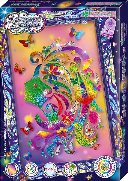 Техника «антистресс-декорирование стикерами» помогает по схеме или по своему вкусу послойно заполнять пространство полупрозрачного матированного пластика фигурными сверкающими элементами и «ювелирными» стразами, постепенно «проявляя» сказочный рисунок - романтичный профиль девушки с изящными волнами локонов, которых коснулось лёгкое дуновение ветерка; яркие цветы и порхающие бабочки дополняют вдохновенный образ. Основа из пластика вставляется в готовую красочную рамку, создавая эффект невесомости искрящегося рисунка. Увлекательное занятие захватывает внимание, приносит с собой радость творчества и отличное настроение!