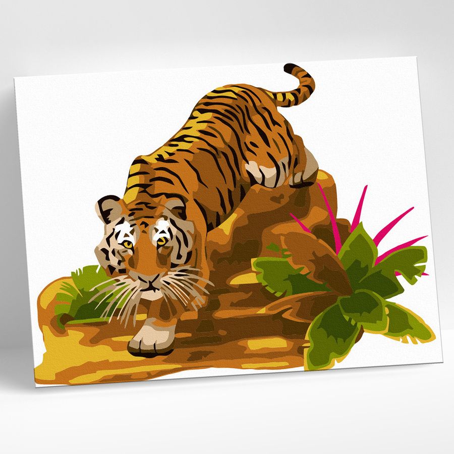"С помощью акриловых красок на холсте можно нарисовать грозного тигра, бесшумно пробирающегося сквозь джунгли. На холст нанесена схема, помогающая правильно выбрать нужный цвет краски. Количество цветов: 13 Уровень сложности: 2 (лёгкий) Состав набора: холст на жестком картонном основании, нейлоновая кисть 1 шт., акриловые краски (устойчивые к выцветанию)."