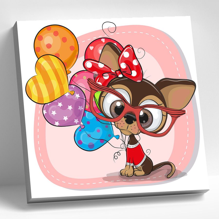 Милейшего щенка в очках, с бантом и со связкой разноцветных шаров можно выложить из мозаичных элементов на холсте. Форма элементов: круглая Количество цветов: 23 Уровень сложности: 3 (средний) Состав набора: холст на подрамнике с клеевой основой, нанесенной схемой рисунка и расшифровкой схемы, пинцет металлический, стилус для захвата элементов, клей-липучка для стилуса, пластиковый контейнер для мозаики, комплект разноцветных мозаичных элементов.