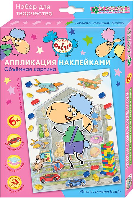 Волшебство техники «Антистресс-декорирование стикерами» (Аппликация наклейками) вовлекает в творчество детей старше 6 лет. Заполнение наклейками переднего плана картины по своему вкусу развивает воображение и мелкую моторику пальчиков ребёнка, готовя его руку к письму в школе. Объём картине придаёт наклеивание пластика с деталями на расстоянии от заднего плана картины, создавая эффект присутствия вместе с барашком Беней в игровой комнате. Красочный дизайн, простота работы и радость встречи с любимым героем мультфильма "Отель у овечек" подарят ребенку отличное настроение!