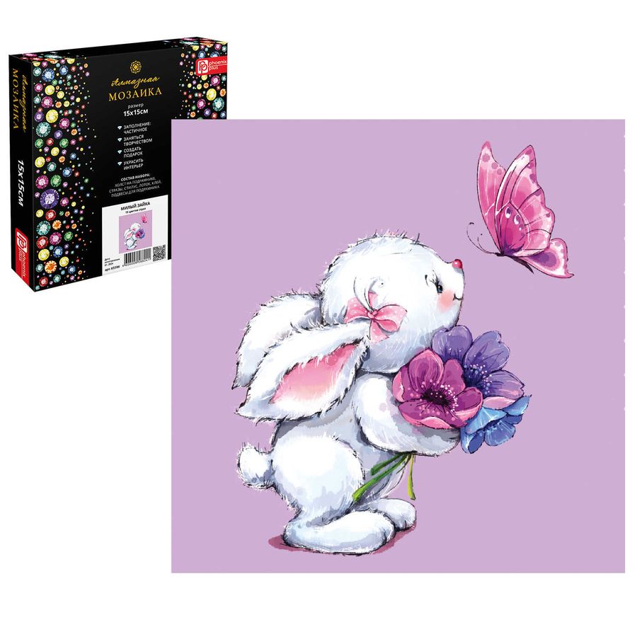 Набор для творчества Алмазная мозаика с частичной выкладкой арт. 65596 / 25 МИЛЫЙ ЗАЙКА, размер: 15*15 см, (15 цветов страз, холст на подрамнике с напечатанной картиной, покрытый клеевым слоем и защитной пленкой, пакеты со стразами, стилус, лоток для страз, силикон для страз, клей, подвесы для подрамника, пинцет металлический, схема, дополнительные пакеты с zip-молнией, стикеры для нумерации zip-пакетов в комплекте, форма страз: круглая, тип выкладки: частичная, картонная коробка с европодвесом)