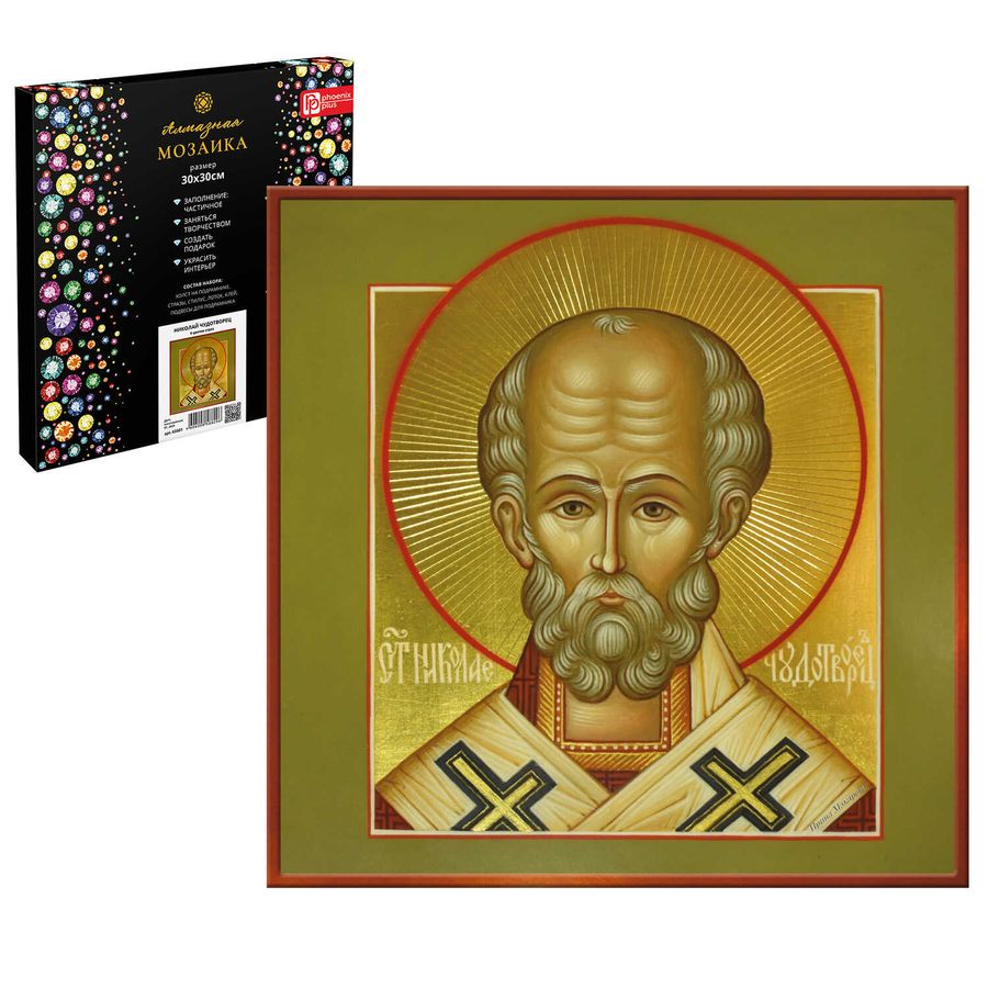 Набор для творчества Алмазная мозаика с частичной выкладкой арт. 65601 / 25 НИКОЛАЙ ЧУДОТВОРЕЦ, размер: 30*30 см, (9 цветов страз, холст на подрамнике с напечатанной картиной, покрытый клеевым слоем и защитной пленкой, пакеты со стразами, стилус, лоток для страз, силикон для страз, клей, подвесы для подрамника, пинцет металлический, схема, дополнительные пакеты с zip-молнией, стикеры для нумерации zip-пакетов в комплекте, форма страз: круглая, тип выкладки: частичная, картонная коробка)