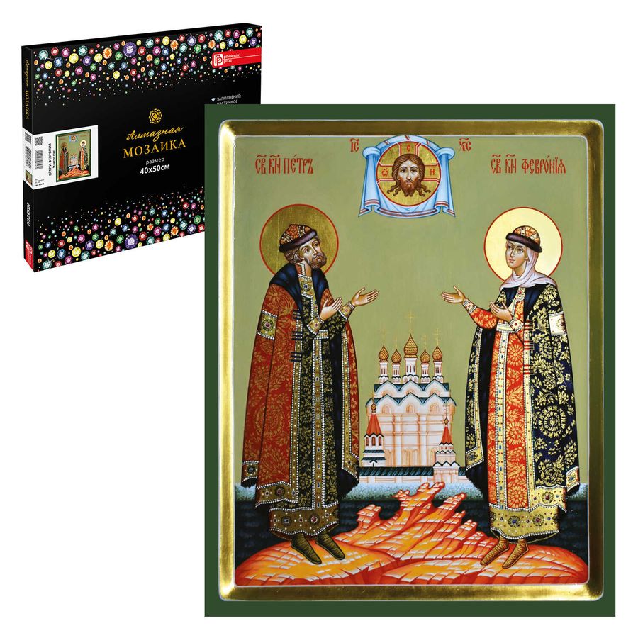 Набор для творчества Алмазная мозаика с частичной выкладкой арт. 65619 / 16 ПЁТР И ФЕВРОНИЯ, размер: 40*50 см, (14 цветов страз, холст на подрамнике с напечатанной картиной, покрытый клеевым слоем и защитной пленкой, пакеты со стразами, стилус, лоток для страз, силикон для страз, клей, подвесы для подрамника, пинцет металлический, схема, дополнительные пакеты с zip-молнией, стикеры для нумерации zip-пакетов в комплекте, форма страз: круглая, тип выкладки: частичная, картонная коробка с ручкой)