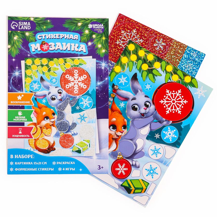 Аппликация форменными стикерами на новый год «Лесные зверюшки», новогодний набор для творчества — это простая и эффектная аппликация! Помогите малышу собрать яркую мозаику: присоединяйте переливающиеся объёмные элементы к картинке-основе в нужном порядке. Самоклеящиеся стикеры выполнены из мягкого блестящего материала, который и создаёт неповторимый эффект. Стикерная мозаика будет отличным подарком для малыша! Поставьте картину на видное место, чтобы шедевр приносил радость близким людям. Чем полезна? Аппликация стикерами способствует развитию логического мышления, чувства прекрасного, усидчивости, сообразительности, мелкой моторики и координации движений. Мозаику удобно брать с собой в гости или в поездку. В набор входит: основа для аппликации с яркой картинкой, набор клеевых стикеров. Раскраска и игры на обороте!