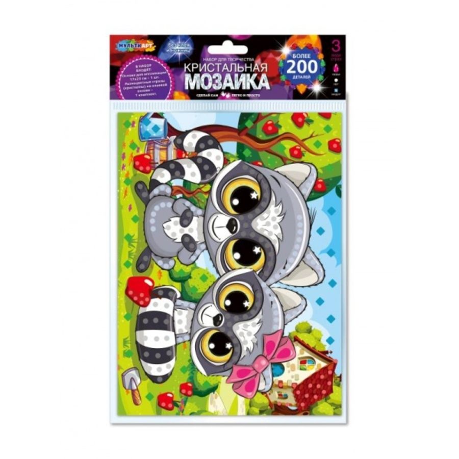 Набор для творчества – кристальная мозаика «Еноты» ТМ «Мульти Арт» – отличный подарок для ребёнка, который будет способствовать развитию его творческих способностей. Особенности и комплектация: - более 200 деталей - 3 вида страз (кристаллов) - без клея и ножниц - понятная инструкция на обороте упаковки При помощи этого набора маленькая художница сможет создать блестящую картину с изображением милых енотов, декорированную сверкающими стразами разных форм и размеров. Готовая поделка станет отличным вариантом для подарка близким или для украшения интерьера детской комнаты. Творческие занятия с кристальной мозаикой ТМ «Мульти Арт» обладают успокаивающим действием, а также развивают: - творческое мышление - цветовое восприятие - усидчивость - внимание - аккуратность Размер: 17 х 23 см. Материал: картон + пластмасса. Рекомендовано детям от 3-х лет.
