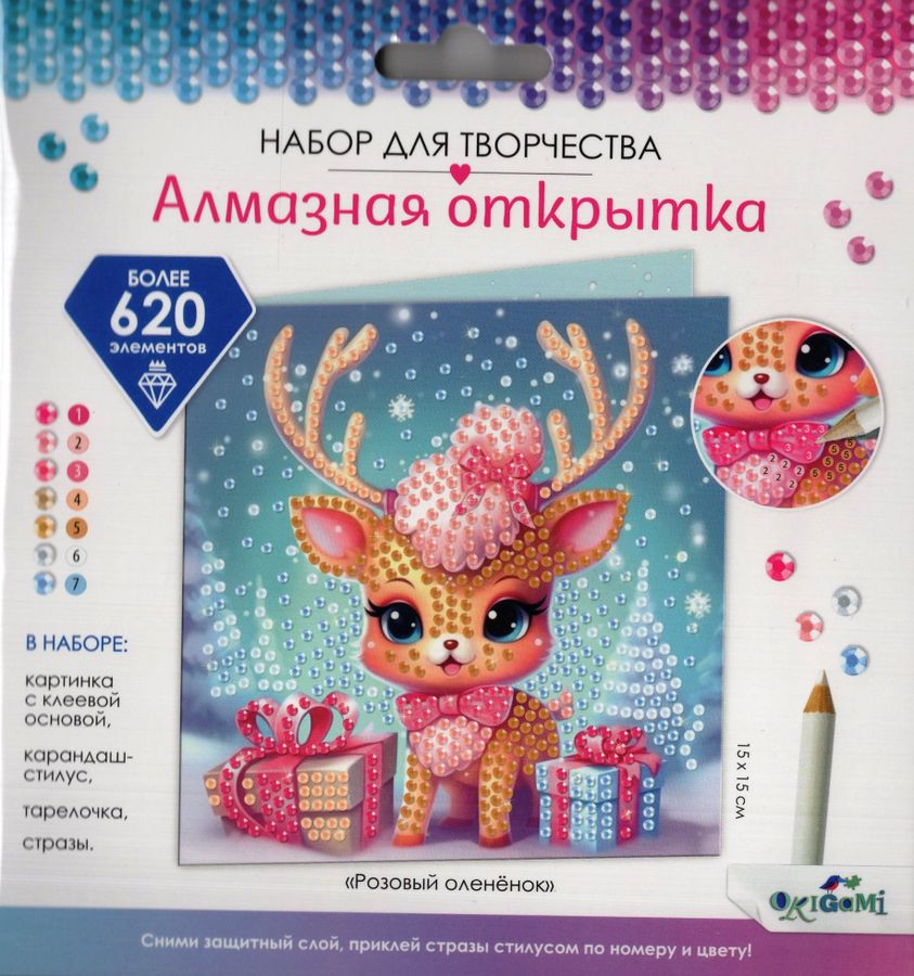 Открытка для детей и взрослых подарит радость и веселье близким! Выложите алмазную открытку и подарите на праздник. Стразы в комплекте оживят красочную иллюстрацию ярким блеском. Творчество-антистресс поможет расслабиться и забыть о повседневных заботах. Процесс создания позволит улучшить мелкую моторику рук и станет интересным хобби для взрослых и детей. Уютный подарок и медитация 2в1! Размер открытки: 15х15 см. Рекомендованный возраст: 3 лет + Комплектность: открытка с клеевой основой изготовлена из картона, стразы и тарелочка из полимерных материалов, карандаш-стилус из дерева.
