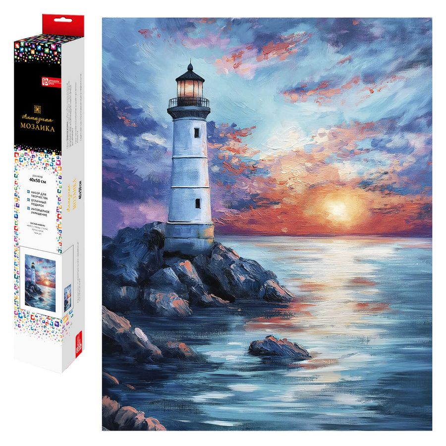 Алмазная мозаика (набор для творчества) арт. 70822 / 50 МАЯК НА ЗАКАТЕ, размер: 40x50 см, (26 цветов страз, холст с напечатанной картиной, покрытый клеевым слоем и защитной пленкой, пакеты со стразами, стилус, лоток для страз, силикон для страз, клей, пинцет металлический, схема, дополнительные пакеты с zip-молнией, стикеры для нумерации zip-пакетов в комплекте, форма страз: квадратная, тип выкладки: полная, картонная коробка с европодвесом)