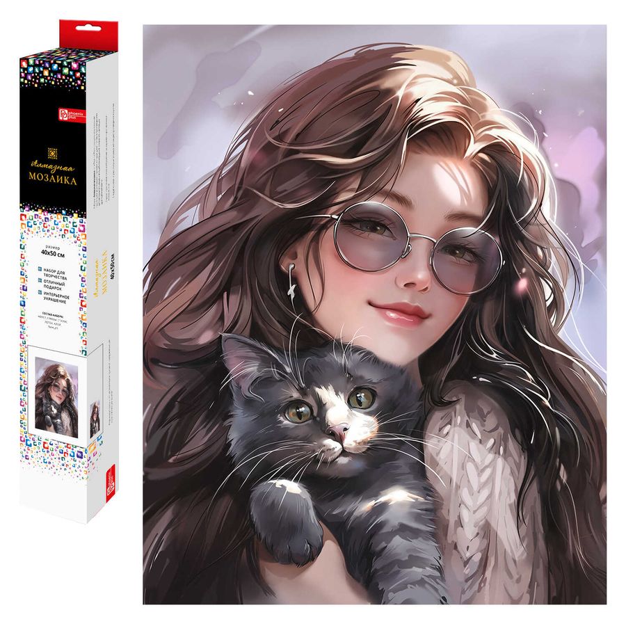 Алмазная мозаика (набор для творчества) арт. 70823 / 50 БРЮНЕТКА С КОТОМ, размер: 40x50 см, (25 цветов страз, холст с напечатанной картиной, покрытый клеевым слоем и защитной пленкой, пакеты со стразами, стилус, лоток для страз, силикон для страз, клей, пинцет металлический, схема, дополнительные пакеты с zip-молнией, стикеры для нумерации zip-пакетов в комплекте, форма страз: квадратная, тип выкладки: полная, картонная коробка с европодвесом)
