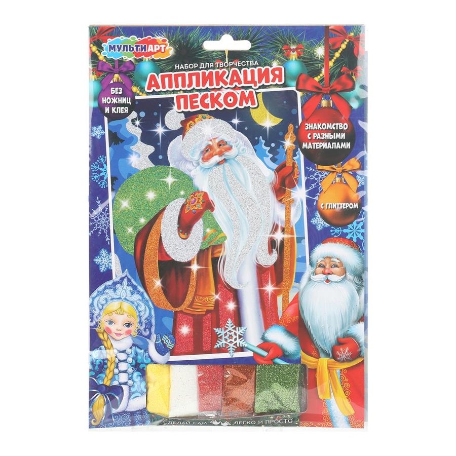 Набор для творчества — аппликация из песка с глиттером «Новый год. Дед Мороз» ТМ «Мульти Арт» — отличный подарок для ребёнка, который будет способствовать развитию его творческих способностей. Комплектация и особенности: - картонная основа для аппликации - 5 пакетиков цветного песка - без клея и ножниц - знакомство с разными материалами - безопасно для детей С помощью красочной основы и разноцветного матового песка с глиттером маленький художник сможет самостоятельно создать аппликацию с изображением Деда Мороза. Готовую поделку можно подарить близким или использовать для украшения интерьера. Занятия с наборами для творчества ТМ «Мульти Арт» развивают: - внимание и усидчивость - творческое мышление - сенсорное и цветовое восприятие - моторику рук - воображение Размер основы: 17 х 23 см. Материал: картон + песок. Рекомендовано детям от 3-х лет.
