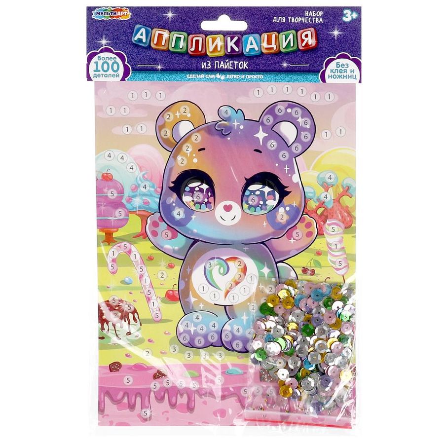 Набор для творчества - аппликация из пайеток ТМ «Мульти Арт» - отличный подарок для вашего ребёнка, который будет способствовать развитию его творческих способностей. Особенности и комплектация: - основа для аппликации - комплект разноцветных пайеток - более 100 деталей - без клея и ножниц С помощью этого набора юный художник сможет самостоятельно создать сверкающую аппликацию с изображением очаровательного медвежонка. Готовую поделку можно подарить близким или использовать для украшения интерьера. Творческие занятия с набором ТМ «Мульти Арт» развивают: - внимание и усидчивость - творческое мышление - сенсорное и цветовое восприятие - моторику рук - фантазию и воображение Размер: 17 х 23 см. Материал: картон + пластмасса. Рекомендовано детям от 3-х лет.