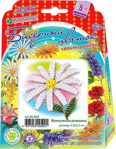 Набор для изготовления цветка из бисера "Жемчужная ромашка" Белая ромашка из перламутрового бисера - чудесное украшение! Плетение может освоить даже начинающая мастерица от 8 лет, достаточно сплести один лепесток, а потом повторить его, совершенствуясь с каждым разом! Это изделие будет интересно как детям, так и взрослым, ведь цветы любят все! Размер готового изделия: 5,5x5,5 см Возраст: для детей старше 8 лет Комплектация: бисер цветной, проволока, пошаговая инструкция со схемами плетения Упаковка: картонный пенал с европодвесом