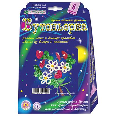 В набор входит: Цветные фигурные пайетки, цветной крупный и мелкий бисер, цветная атласная лента, проволока, пошаговая инструкция. Земляника – ароматная вкусная ягода, наполненная солнечным теплом и светом. Земляника была известна ещё древним римлянам и грекам как лекарственное растение, а племенами Древней Руси она была любима за свои вкусовые и полезные свойства. Создайте свой изящный букетик земляники из пайеток и бисера! Цветы и листья для букета изготовить не сложно: бисер и пайетки нанизываются на проволоку и проволока скручиваeтся в стебель, затем стебельки складываются вместе и украшаются бантом из атласной ленты. Словно ювелирное украшение, букетик можно можно приколоть булавкой к платью и получить эффектную брошь – бутоньерку, а можно поставить в маленькую вазочку.