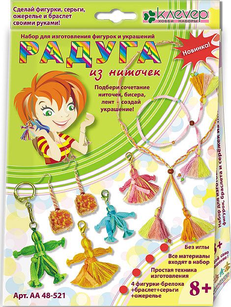 Яркие цветные мулине – так и хочется что-то ими украсить! Набор «Радуга из ниточек» даёт возможность рукодельнице изготовить весёлые фигурки и украшения из ниток мулине без иглы: большие и маленькие фигурки-брелоки мальчика и девочки, ожерелье, браслетик и серёжки. Для этого потребуется простая техника изготовления кистей и помпонов, которые девочка также научится делать с помощью наших шаблонов и инструкции с фотографиями. Предлагаемые сочетания цветов мулине – не только эффектные, но и актуальные.