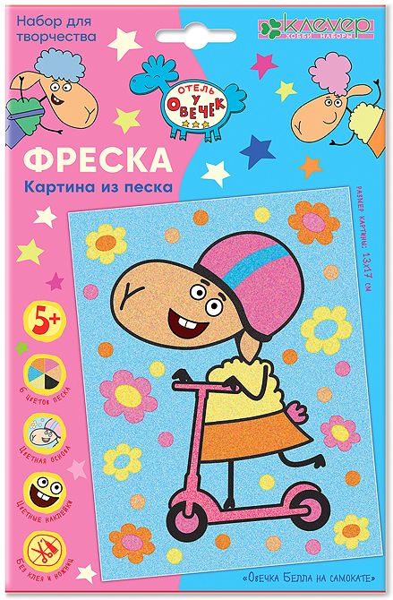 Рисование песком — популярный вид творчества у детей старше 5 лет. Создавая песочную картину с овечкой Беллой на самокате из мультфильма "Отель у овечек", ребёнок почувствует себя настоящим художником. Творчество с песком помогает развивать воображение ребёнка, внимательность, аккуратность, мелкую моторику его пальчиков, через моторику — речь, память и координацию. Занятие с песком гармонизирует эмоции ребёнка и раскрывает широту творческого восприятия мира. Картина из песка выглядит очень декоративно! Комплектация: цветной песок - 6 цветов, цветные детали из самоклейки, самолеящаяся фон-основа, зубочистка, инструкция на упаковке