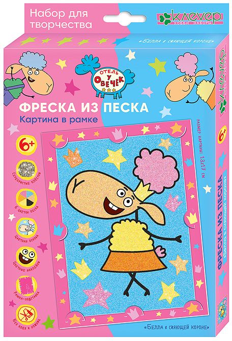 Рисование песком — популярный вид творчества у детей старше 6 лет. Создавая песочную картину с овечкой Беллой в короне среди звёзд и корон из мультфильма «Отель у овечек», ребёнок почувствует себя настоящим художником. Добавление блёсток в песок для «раскрашивания» звёзд и корон и размещение фрески в рамке-подставке прадают песочной картине законченный вид. Творчество с песком помогает развивать воображение ребёнка, внимательность, аккуратность, мелкую моторику его пальчиков, через моторику — речь, память и координацию. Занятие с песком гармонизирует эмоции ребёнка и раскрывает широту творческого восприятия мира. Картина из песка выглядит очень декоративно!