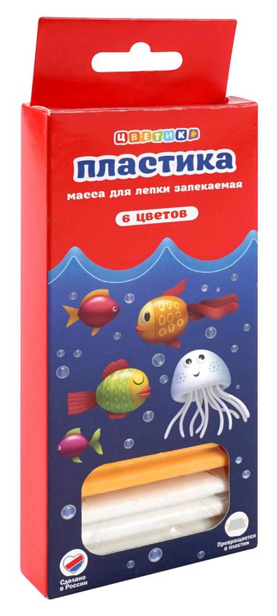 Пластика 6 цветов 120гр. Цветик карт/уп для детского творчества Предназначена для лепки и моделирования. Обладает уникальными свойствами: отличной пластичностью в сочетании со способностью отвердевать при термообработке, хорошо размягчается, не липнет и не пачкает руки. После отверждения изделия из пластики "Цветик" прекрасно окрашиваются акриловыми красками. Пластика легко снимается с одежды и коврового покрытия, а остаток смывается водой с мылом. Инструкция по применению: Размять пластику. Изделие выложить на противень и прогреть при температуре 130 градусов в духовом шкафу в течение 3-10 минут (в зависимости от размеров), соблюдая меры предосторожности (нельзя превышать температуру обжига выше 130 градусов). Дайте изделию остыть, отвердеть. После занятий лепкой руки протереть влажной салфеткой, затем вымыть водой с мылом.