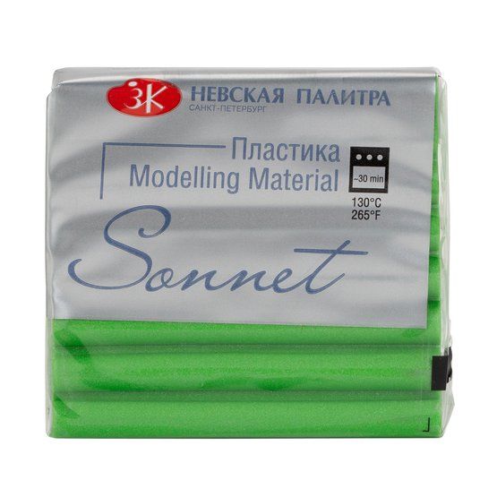 Цвет: зеленый бриллиант. Полимерная глина (пластика) ТМ "Sonnet" обладает деликатным мерцающим эффектом. Подходит для лепки бижутерии, фигурок, миниатюр и прочего. Становится пластичной и податливой после активного разминания. Запекать в духовом шкафу при температуре 130°С 10-30 минут (в зависимости от толщины изделия). Окрашивается художественной пастелью до и после запекания, в зависимости от желаемого эффекта. В последнем случае, обязательно пастель закрепить лаком. Также после обжига, остывшее изделие можно раскрасить акриловыми красками и/или покрыть лаком для полимерной глины для придания изделию блеска.