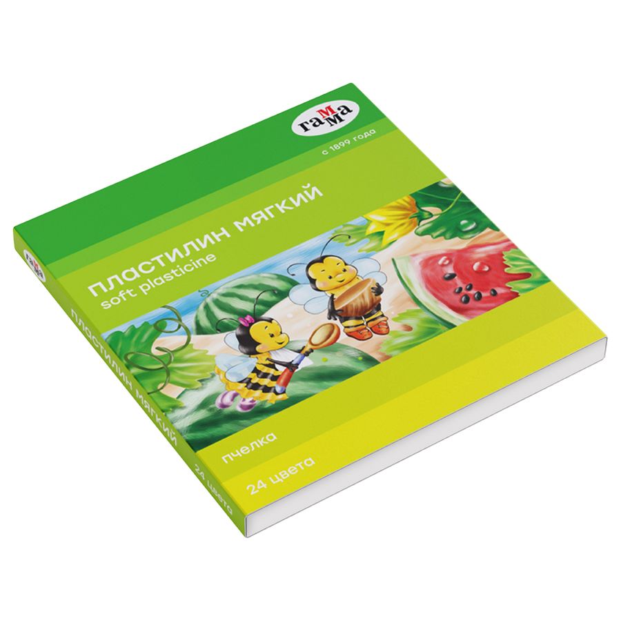 Восковой пластилин ГАММА серии «Пчёлка» в обновлённом дизайне. В наборе 24 цвета. Вес бруска — 15 г. Разработан специально для детей от 3 до 6 лет. Благодаря высокому содержанию мягкого воска пластилин очень легко разминается детскими ручками. Не пачкает руки и рабочую поверхность. Пластилин ярких сочных цветов отлично подходит для фигурной лепки и создания картин. Пластиковый стек в комплекте. • Количество цветов: 24 • Вес бруска: 15 г • Форма бруска: прямоугольная • Упаковка ед. товара: картонная коробка