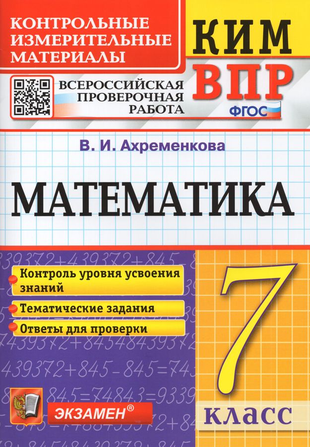 Данное пособие полностью соответствует федеральному государственному образовательному стандарту (второго поколения). В данном пособии представлены контрольные измерительные материалы по математике для учащихся 7-го класса. Тематика предлагаемых заданий охватывает все темы 7-го класса, соответствует программе общеобразовательных организаций по математике и аналогичным материалам ВПР. Назначение пособия - отработка практических навыков учащихся при подготовке к Всероссийской проверочной работе. В пособии предложены рекомендации по оцениванию работы и ответы ко всем заданиям.