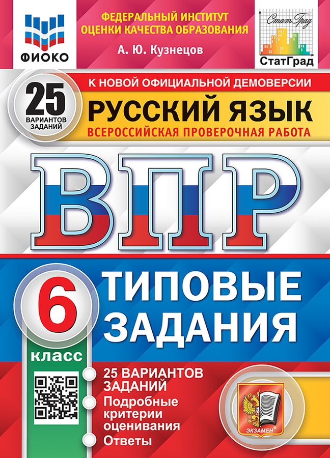 Данное пособие полностью соответствует федеральному государственному образовательному стандарту. Книга содержит 25 вариантов типовых заданий Всероссийской проверочной работы (ВПР) по русскому языку для учащихся 6-х классов. Сборник предназначен учащимся 6-х классов, учителям и методистам, использующим типовые задания для подготовки к Всероссийской проверочной работе по русскому языку.