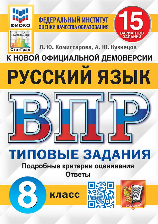 Данное пособие полностью соответствует федеральному государственному образовательному стандарту (второго поколения). В пособии представлены 15 вариантов типовых заданий Всероссийской проверочной работы (ВПР) по русскому языку для учащихся 8-х классов. Ко всем заданиям даны ответы и подробные критерии оценивания. Пособие необходимо учащимся 8-х классов, учителям и методистам, использующим типовые задания для подготовки к Всероссийской проверочной работе по русскому языку. Приказом №699 Министерства образования и науки РФ учебные пособия издательства "Экзамен" допущены к использованию в общеобразовательных организациях.