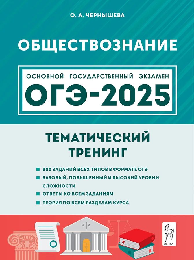 Тематический тренинг предназначен для подготовки девятиклассников к ОГЭ 2025 по обществознанию. Книга содержит задания по тематическим разделам: «Человек как результат биосоциальной эволюции», «Общество», «Сфера духовной культуры», «Экономика» (в том числе задания по финансовой грамотности), «Социальная сфера», «Сфера политики и социального управления», «Право», а также задания, посвящённые работе с иллюстративным материалом. Пособие включает в себя: теоретический материал по всем темам курса; 10 вариантов заданий в формате ОГЭ по каждому разделу; тексты и вопросы к ним (задания высокого уровня сложности); ответы ко всем заданиям. Последовательность размещения материала соответствует логике изучения курса обществознания в основной школе и является оптимальной при самостоятельной подготовке к экзамену. Учитель может использовать материалы тренинга на различных этапах урока в 8–9-х классах при подготовке учащихся к ОГЭ. Пособие будет полезно и при организации дистанционного обучения.