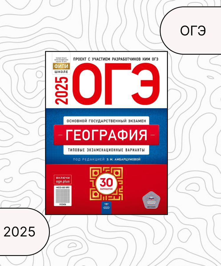 Серия подготовлена разработчиками контрольных измерительных материалов (КИМ) основного государственного экзамена. В сборнике представлены: • 30 типовых экзаменационных вариантов, составленных в соответствии с проектом демоверсии КИМ ОГЭ по географии 2025 года; • инструкция по выполнению экзаменационной работы; • ответы ко всем заданиям; • критерии оценивания. Выполнение заданий типовых экзаменационных вариантов предоставляет обучающимся возможность самостоятельно подготовиться к государственной итоговой аттестации в 9-м классе в форме ОГЭ, а также объективно оценить уровень своей подготовки к экзамену. Учителя могут использовать типовые экзаменационные варианты для организации контроля результатов освоения школьниками образовательных программ основного общего образования и интенсивной подготовки обучающихся к ОГЭ.