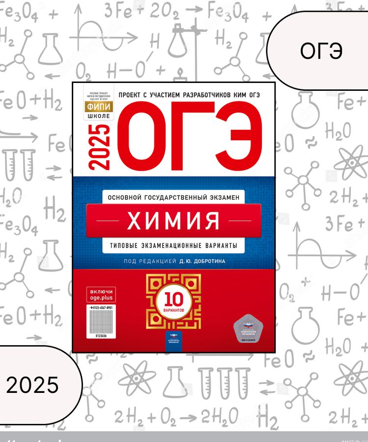 Серия подготовлена разработчиками контрольных измерительных материалов (КИМ) основного государственного экзамена. В сборнике представлены: • 10 типовых экзаменационных вариантов, составленных в соответствии с проектом демоверсии КИМ ОГЭ по химии 2025 года; • инструкция по выполнению экзаменационной работы; • ответы ко всем заданиям; • критерии оценивания. Выполнение заданий типовых экзаменационных вариантов предоставляет обучающимся возможность самостоятельно подготовиться к государственной итоговой аттестации в 9-м классе в форме ОГЭ, а также объективно оценить уровень своей подготовки к экзамену. Учителя могут использовать типовые экзаменационные варианты для организации контроля результатов освоения школьниками образовательных программ основного общего образования и интенсивной подготовки обучающихся к ОГЭ.