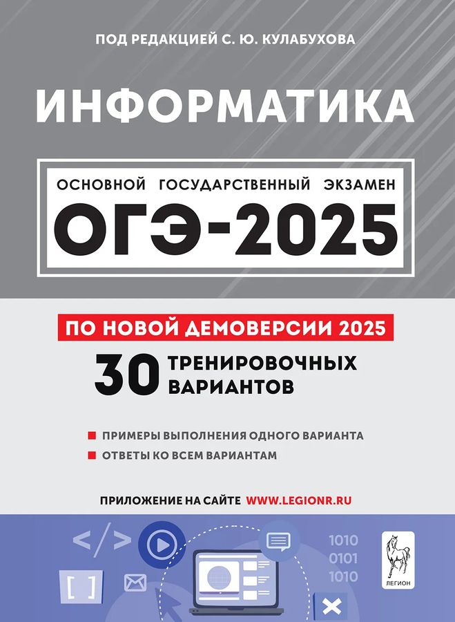 Учебное пособие предназначено для подготовки к ОГЭ по информатике. Книга содержит: 30 тренировочных вариантов, составленных по проектам спецификации и демоверсии ОГЭ 2025 года, опубликованным на сайте ФИПИ www.fipi.ru 21.08.2024; образец выполнения одного варианта с комментариями; развёрнутые ответы к заданиям 14, 15 и 16 всех вариантов; ответы ко всем заданиям. Работа с книгой позволит девятиклассникам качественно подготовиться к ОГЭ по информатике. Учитель может использовать пособие на любых этапах урока, при подготовке обучающихся к ОГЭ, при мониторинге их успеваемости.
