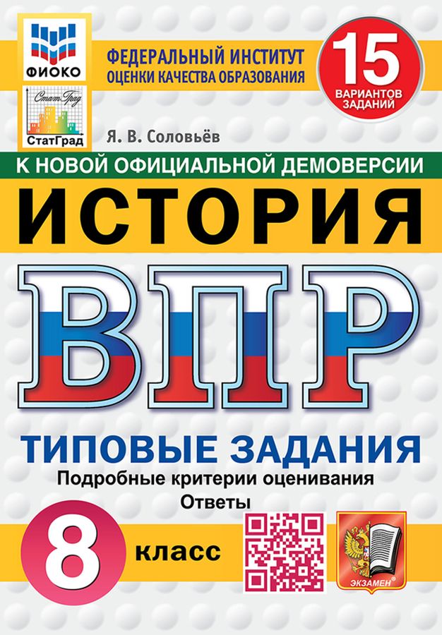Данное пособие полностью соответствует федеральному государственному образовательному стандарту. Книга содержит 15 вариантов типовых заданий Всероссийской проверочной работы (ВПР) по истории для учащихся 8-х классов. Сборник предназначен учащимся 8-х классов, учителям и методистам, использующим типовые задания для подготовки к Всероссийской проверочной работе по истории. Я. В. Соловьёв - кандидат исторических наук, доцент кафедры истории России Государственного университета просвещения, старший научный сотрудник Научно-просветительского отдела Государственной публичной исторической библиотеки России, автор пособий по истории России, ЕГЭ, ОГЭ и ВПР. Приказом №699 Министерства образования и науки Российской Федерации учебные пособия издательства "Экзамен" допущены к использованию в общеобразовательных организациях.