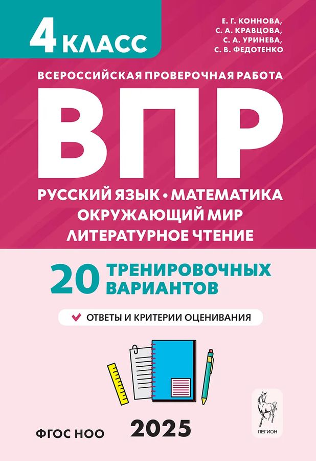 Порядок проведения ВПР в 4-м классе в 2025 году будет изменён. Русский язык и математика становятся обязательными предметами для сдачи ВПР. Окружающий мир теперь является предметом по выбору наряду с литературным чтением и иностранным языком. Наше пособие предлагает варианты по двум из необязательных предметов; варианты по английскому языку выпускаются отдельным пособием. Пособие содержит: 20 вариантов в формате ВПР: по каждому предмету — русскому языку, математике, окружающему миру и литературному чтению — предлагаются 5 вариантов; инструкции для школьников; ответы ко всем заданиям и критерии оценивания. Задания соответствуют описаниям и образцам проверочных работ, опубликованным на сайте https://fioco.ru. Все варианты единообразно структурированы и имеют одинаковый уровень сложности. Пособие адресовано учителям, четвероклассникам и их родителям.