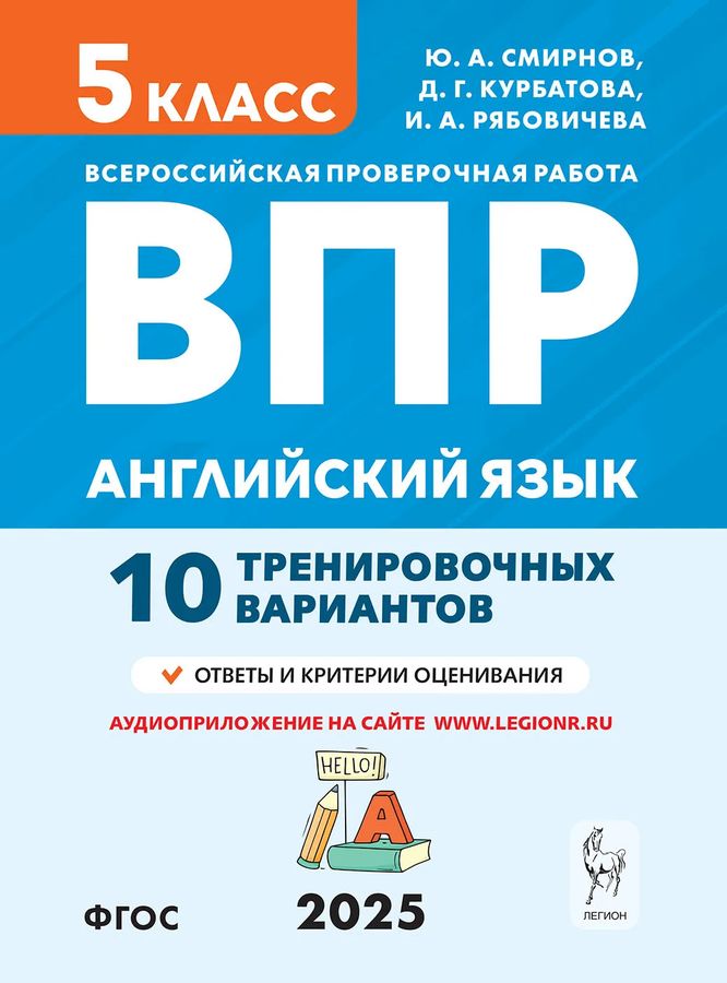 Пособие предназначено для подготовки обучающихся 5-х классов к всероссийской проверочной работе по английскому языку. Книга содержит 10 тренировочных вариантов в формате ВПР, разработанных в соответствии с образцом и описанием всероссийской проверочной работы, опубликованными на сайте ФИОКО, систему оценивания заданий, тексты для аудирования и ответы к заданиям. Издание рекомендуется использовать на уроках контроля, дополнительных занятиях по английскому языку или дома самостоятельно.