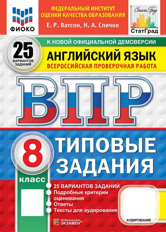 Данное пособие полностью соответствует федеральному государственному образовательному стандарту. Книга содержит 25 вариантов типовых заданий Всероссийской проверочной работы (ВПР) по английскому языку для учащихся 8-х классов. Сборник предназначен учащимся 8-х классов, учителям и методистам, использующим типовые задания для подготовки к Всероссийской проверочной работе по английскому языку.