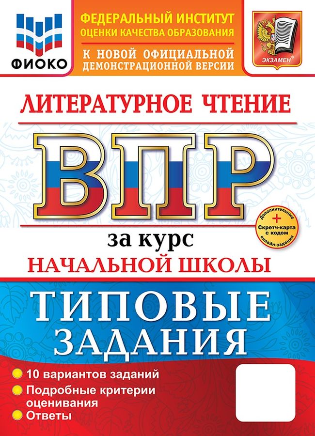 Данное пособие полностью соответствует федеральному государственному образовательному стандарту для начальной школы. Книга содержит 10 вариантов типовых заданий Всероссийской проверочной работы (ВПР) за курс начальной школы. Ответы к заданиям являются материалами для учителя, а потому могут быть легко изъяты, что повышает объективность оценки знаний учащихся. Сборник предназначен учащимся 4-х классов начальной школы, учителям и методистам, использующим типовые задания для подготовки к Всероссийской проверочной работе за курс начальной школы.