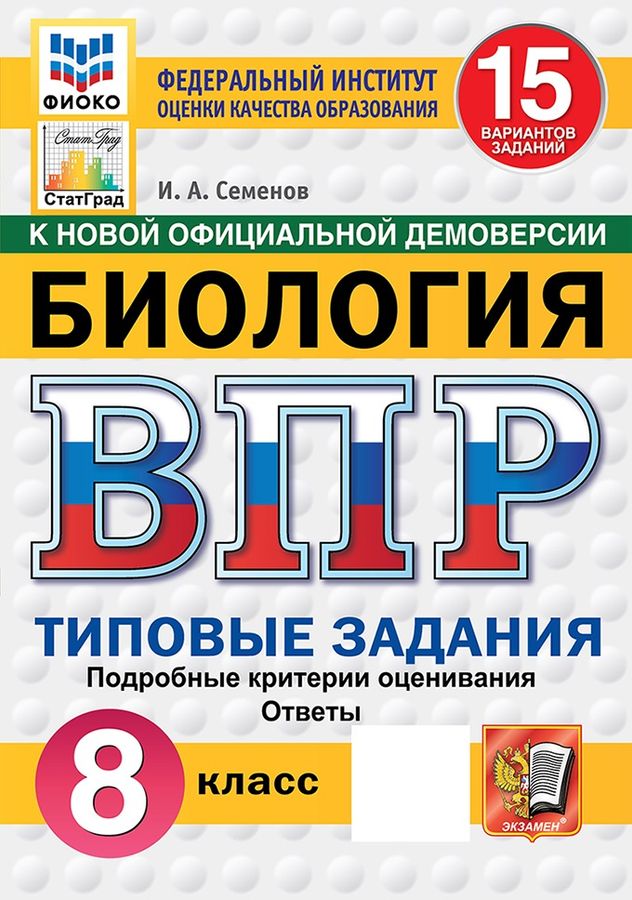 Данное пособие полностью соответствует федеральному государственному образовательному стандарту. Книга содержит 15 вариантов типовых заданий Всероссийской проверочной работы (ВПР) по биологии для учащихся 8-х классов. Сборник предназначен учащимся 8-х классов, учителям и методистам, использующим типовые задания для подготовки к Всероссийской проверочной работе по биологии.