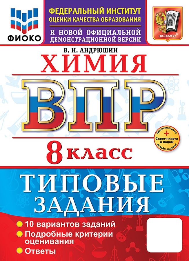 Данное пособие полностью соответствует федеральному государственному образовательному стандарту. В пособии представлены 10 вариантов типовых заданий Всероссийской проверочной работы (ВПР) по химии для учащихся 8-х классов. Ко всем заданиям даны ответы и подробные критерии оценивания. Сборник предназначен учащимся 8-х классов, учителям и методистам, использующим типовые задания для подготовки к Всероссийской проверочной работе по химии.