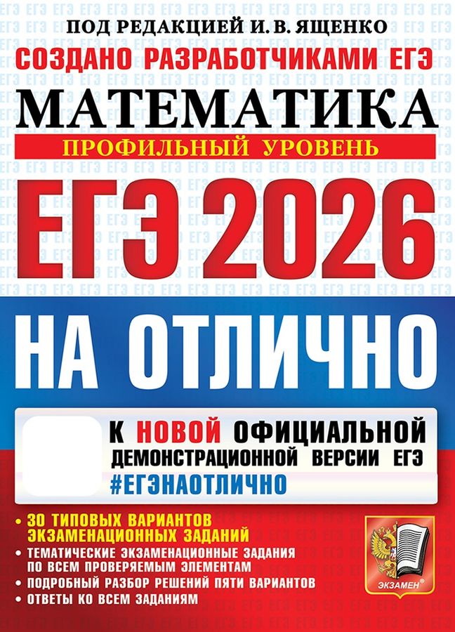 Предлагаемое пособие необходимо старшеклассникам для подготовки к сдаче Единого государственного экзамена по математике профильного уровня в 2026 году на отличный результат. Пособие содержит тематические экзаменационные задания по всем проверяемым элементам содержания Единого государственного экзамена по математике профильного уровня, 30 типовых вариантов экзаменационных заданий 2026 года, подробный разбор решений пяти вариантов, инструкцию по выполнению работы, бланки ответов и ответы ко всем заданиям. Тематические экзаменационные задания помогут закрепить изученный материал, дадут возможность отработать как все темы в целом, так и только те, которые покажутся сложными. Выполнение типовых вариантов экзаменационных заданий за установленное время позволит приблизить ситуацию к экзаменационной.