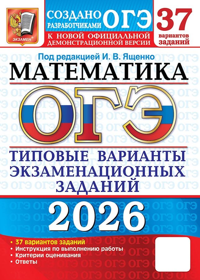 Авторы заданий - ведущие специалисты, принимающие непосредственное участие в разработке методических материалов для подготовки к выполнению контрольных измерительных материалов ОГЭ. Пособие содержит 37 типовых вариантов экзаменационных заданий по математике. Все задания составлены с учётом особенностей и требований Основного государственного экзамена, полностью соответствуют демоверсии, спецификации и кодификатору ОГЭ 2026 года по математике, опубликованным на сайте ФИПИ. Назначение пособия - отработка практических навыков учащихся по подготовке к экзамену по математике в 9 классе. В сборнике даны ответы ко всем заданиям. Пособие адресовано учителям и методистам, использующим типовые варианты экзаменационных заданий для подготовки учащихся к Основному государственному экзамену 2026 года, оно также может быть использовано учащимися для самоподготовки и самоконтроля.