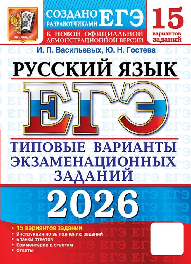Авторы заданий - специалисты, принимающие непосредственное участие в разработке заданий ЕГЭ. Пособие содержит 15 типовых вариантов экзаменационных заданий по русскому языку. Все задания составлены с учётом особенностей и требований Единого государственного экзамена, полностью соответствуют демоверсии, спецификации и кодификатору ЕГЭ 2026 года по русскому языку, опубликованным на сайте ФИПИ. Назначение пособия - дать читателям представление о структуре и содержании КИМ по русскому языку, степени трудности заданий. В сборнике даны ответы ко всем вариантам тестов и приводится подробное объяснение выполнения заданий одного варианта. Кроме того, приведены образцы бланков, используемых на ЕГЭ для записи ответов. Пособие адресовано учащимся-старшеклассникам для самоподготовки и самоконтроля, а также учителям для подготовки учащихся к экзамену по русскому языку.
