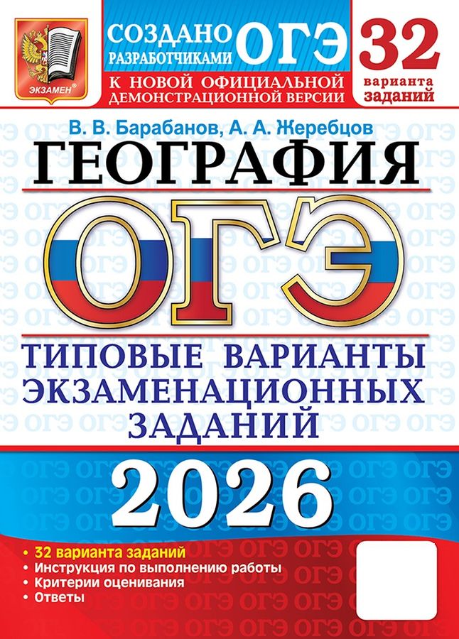 Пособие содержит 32 типовых варианта экзаменационных заданий по географии. Все задания составлены с учётом особенностей и требований Основного государственного экзамена, полностью соответствуют демонстрационному варианту, спецификации и кодификатору ОГЭ 2026 года по географии, опубликованным на сайте ФИПИ. Назначение пособия - предоставить возможность обучающимся отработать навыки выполнения заданий, аналогичных заданиям, предоставленным в демонстрационной версии ОГЭ по географии. Пособие адресовано учителям для подготовки учащихся к Основному государственному экзамену, а учащимся-девятиклассникам - для самоподготовки и самоконтроля.