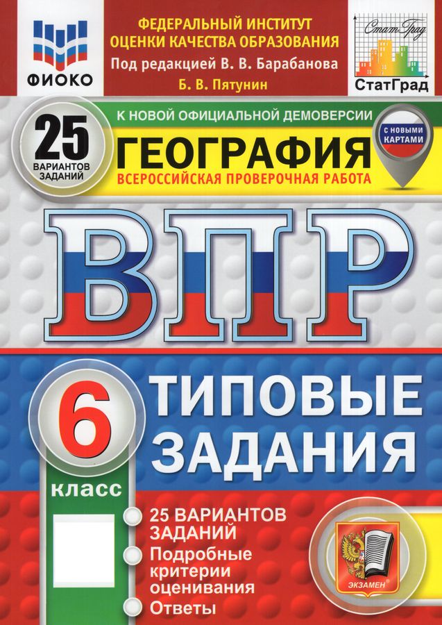 Данное пособие полностью соответствует федеральному государственному образовательному стандарту. Книга содержит 25 вариантов типовых заданий Всероссийской проверочной работы (ВПР) по географии для учащихся 6-х классов. Сборник предназначен учащимся 6-х класоов, учителям и методистам, использующим типовые задания для подготовки к Всероссийской проверочной работе по географии.