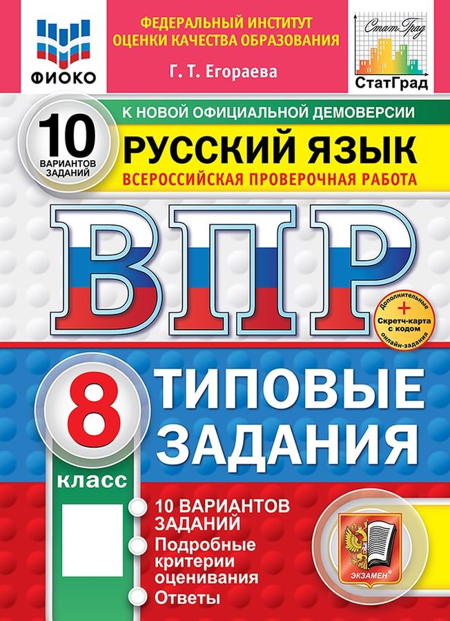 Данное пособие полностью соответствует федеральному государственному образовательному стандарту. Книга содержит 10 вариантов типовых заданий Всероссийской проверочной работы (ВПР) по русскому языку для учащихся 8-х классов. Сборник предназначен учащимся 8-х классов, учителям и методистам, использующим типовые задания для подготовки к Всероссийской проверочной работе по русскому языку. Приказом №699 Министерства образования и науки РФ учебные пособия издательства "Экзамен" допущены к использованию в общеобразовательных организациях.