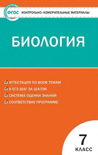 В пособии представлены контрольно-измерительные материалы (КИМы) по биологии для 7 класса. Все задания соответствуют требованиям школьной программы и возрастным особенностям учащихся. Структура КИМов аналогична структуре тестов в формате ЕГЭ, что позволит постепенно подготовить учащихся к работе с подобным материалом. В конце издания предложены ключи к тестам. Пособие адресовано учителям, школьникам и их родителям.