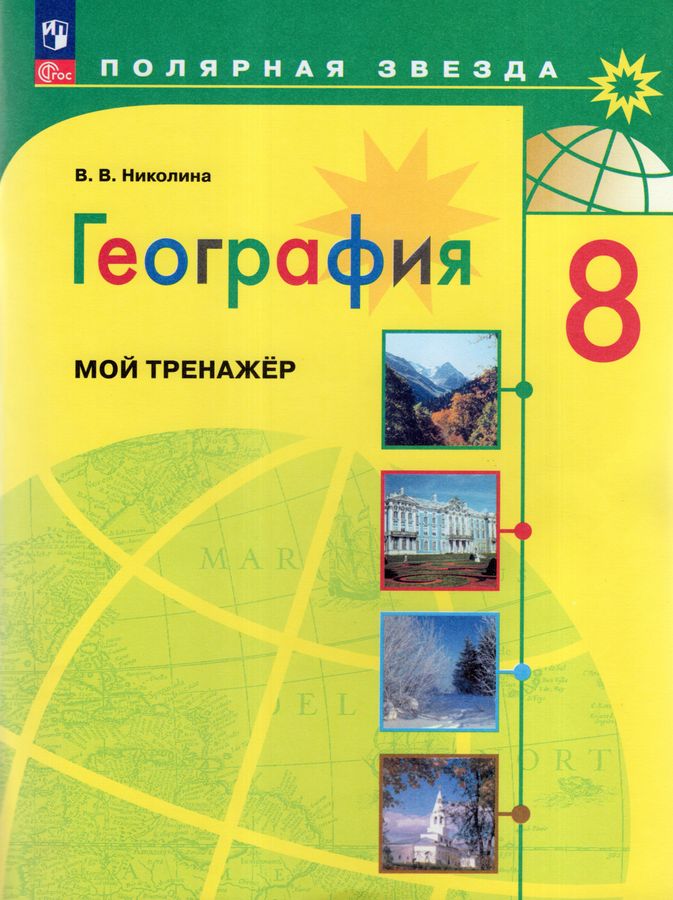 Учебное пособие Мой тренажёр География 8 класс Просвещение 2024 год Автор Николина В.В. Данное пособие является составной частью учебно-методического комплекта по курсу «География. 8 класс» серии «Полярная звезда» и предназначено для практических и самостоятельных работ обучающихся. Задания, содержащиеся в тренажёре, сгруппированы в рубрики и предусматривают работу с текстом учебника, контурными картами, картами атласа и учебника, диаграммами и др. Задания охватывают все темы курса и нацелены на более глубокое и прочное усвоение знаний. Границы государств и административно-территориальное деление Российской Федерации на картах даны на октябрь 2022 г.