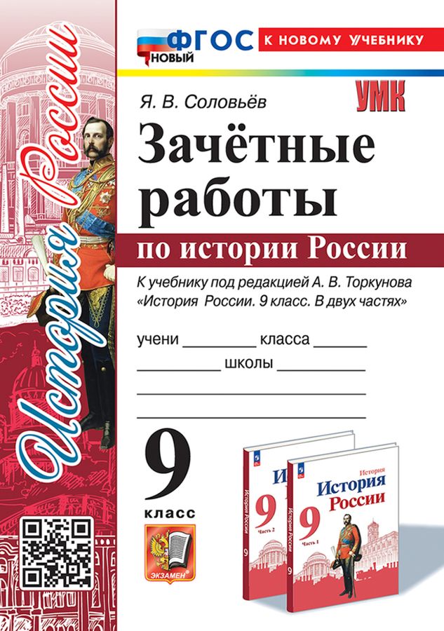 Данное пособие полностью соответствует федеральному государственному образовательному стандарту. Пособие включает зачётные работы по истории России, которые соответствуют содержанию и структуре учебника под редакцией А. В. Торкунова "История России. 9 класс. В двух частях". Задания можно использовать для обучения и самоконтроля учащихся, проверки домашних заданий, текущего и итогового контроля, подготовки к ОГЭ. Ко всем заданиям даны ответы. Пособие предназначено учащимся 9 классов, учителям и методистам. Я. В. Соловьёв - кандидат исторических наук, доцент Государственного университета просвещения, старший научный сотрудник Государственной публичной исторической библиотеки России, автор пособий по истории России.