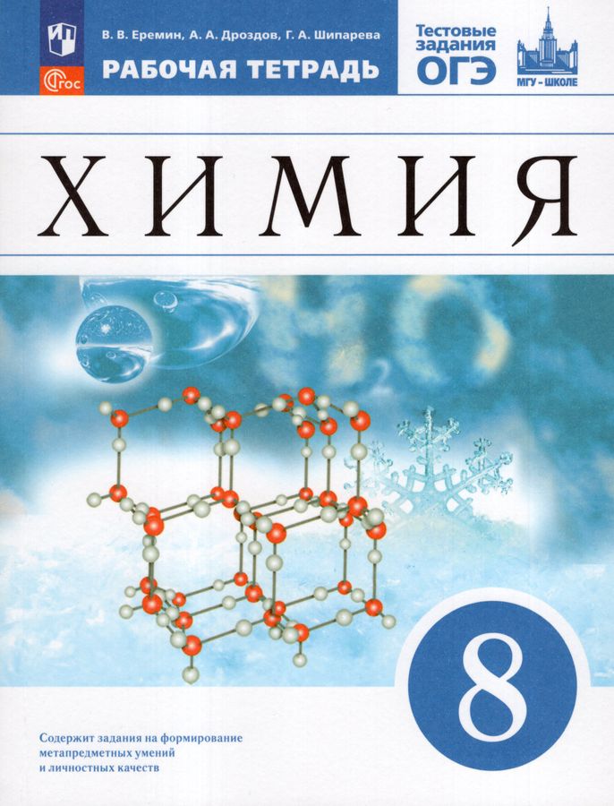 ЕГЭ Рабочая тетрадь Химия 8 класс Просвещение 2024 год Авторы Еремин В.В., Дроздов А.А., Шипарева Г.А. Предлагаемая тетрадь — часть учебного комплекта к учебнику В. В. Еремина, Н. Е. Кузьменко, А. А. Дроздова, В. В. Лунина «Химия. 8 класс». Помимо тетради в состав УМК входят методическое пособие, рабочая программа, поурочные разработки, контрольные и проверочные работы, тетрадь для лабораторных опытов и практических работ и задачник. Специальными знаками отмечены задания, направленные на формирование метапредметных умений (планировать деятельность, выделять различные признаки, сравнивать, классифицировать, устанавливать причинно-следственные связи, преобразовывать информацию и др.) и личностных качеств учеников.