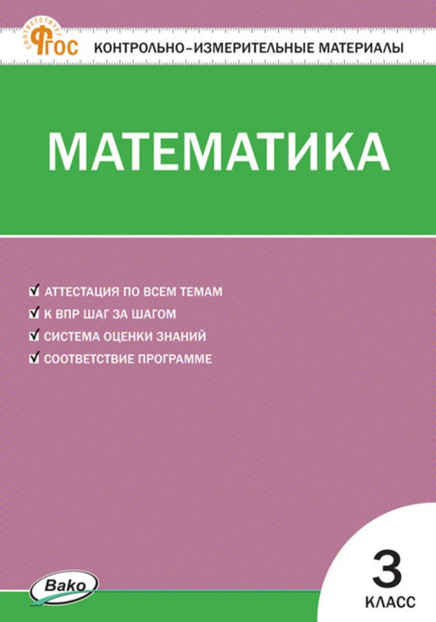 В пособии представлены контрольно-измерительные материалы по математике для 3 класса. Порядок тем соответствует учебнику М.И. Моро и др. УМК «Школа России», входящему в действующий федеральный перечень учебников. Все задания соответствуют программе общеобразовательных организаций и требованиям действующего ФГОС для начальной школы. Систематическая работа с материалами сборника позволит обучить школьников работе с тестами, что поможет в дальнейшем успешно выполнить задания государственной аттестации. Издание адресовано учителям начальных классов, школьникам и их родителям.